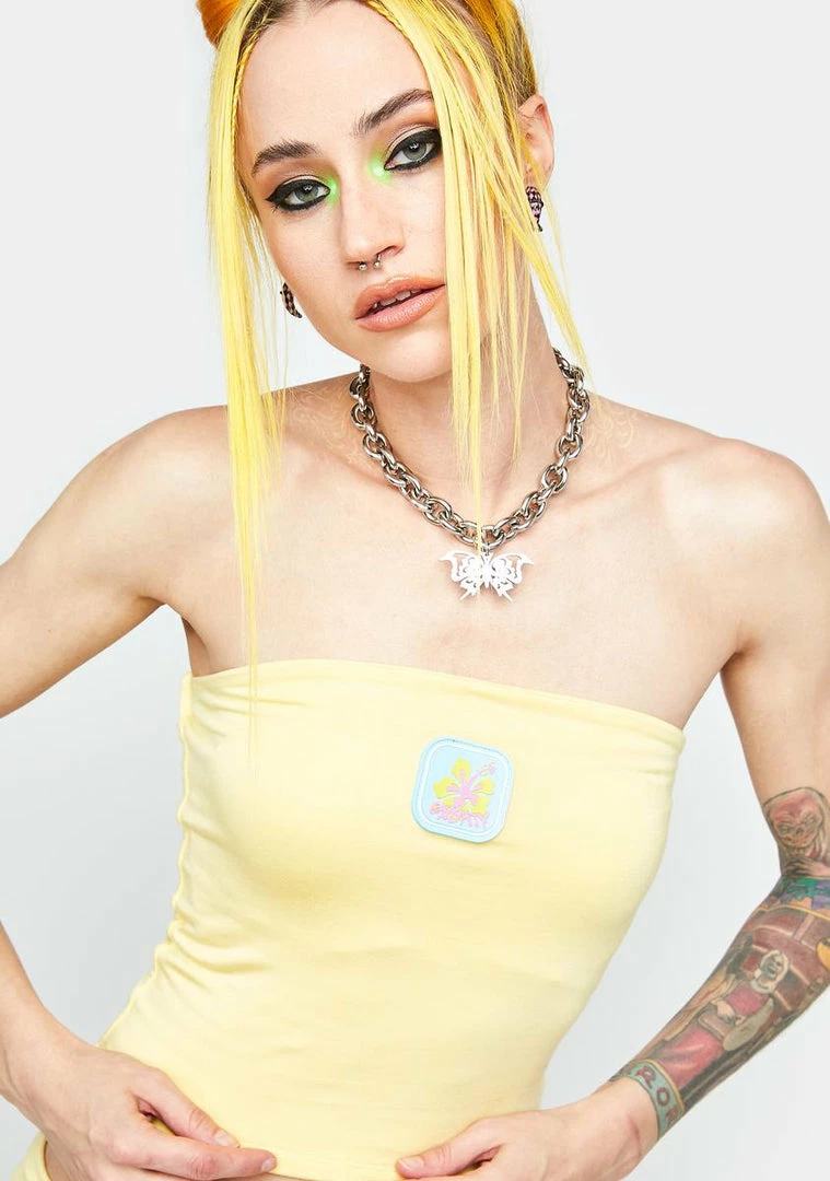 you’re living on island time. This tube top has a soft and stretchy material, a cropped fit, and a graphic badge detail on the front.