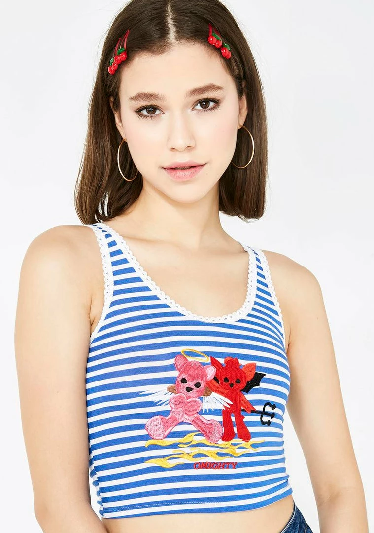 cuz the angel NΓ’ΒΒ the devil wanna fight for ya babe! First youΓ’ΒΒre sour, then youΓ’ΒΒre sweet in this supa cute crop tank top that has a scoop neckline, scallop trims, a stripe pattern, and a beary nice NΓ’ΒΒ naughty graphic on the front.