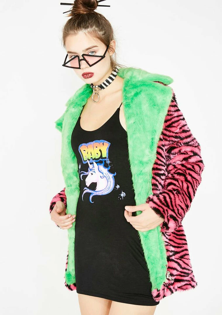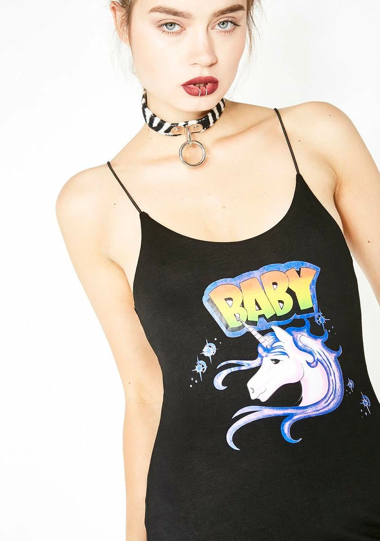 cuz youΓ’ΒΒre a MF unicorn babe. ItΓ’ΒΒs a dream come true in this cute lil graphic dress that has a dime piece bodycon fit, supa skinny elastic cami straps, and a lovable graffiti screen print across the front.