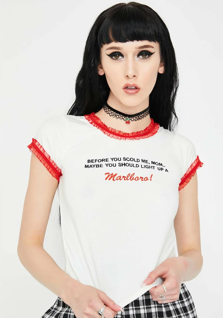 mom, mom, MOM…need a light? Calm ya nervez in this rad baby tee that has bag grl text graphics on the front and contrast ruffle trim.