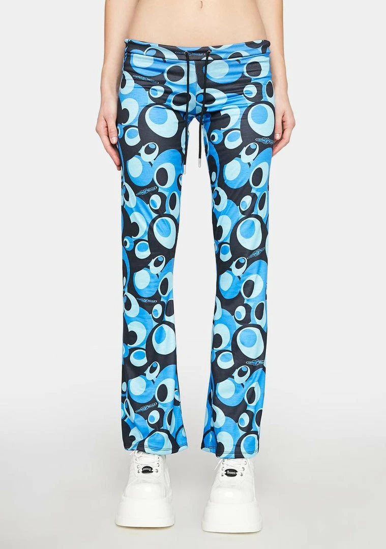 has a low-rise drawstring waistband, an all over bubble print, and a flared leg silhouette.