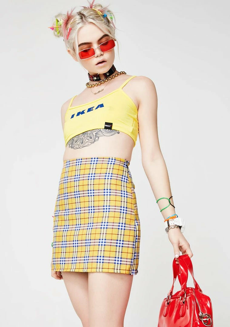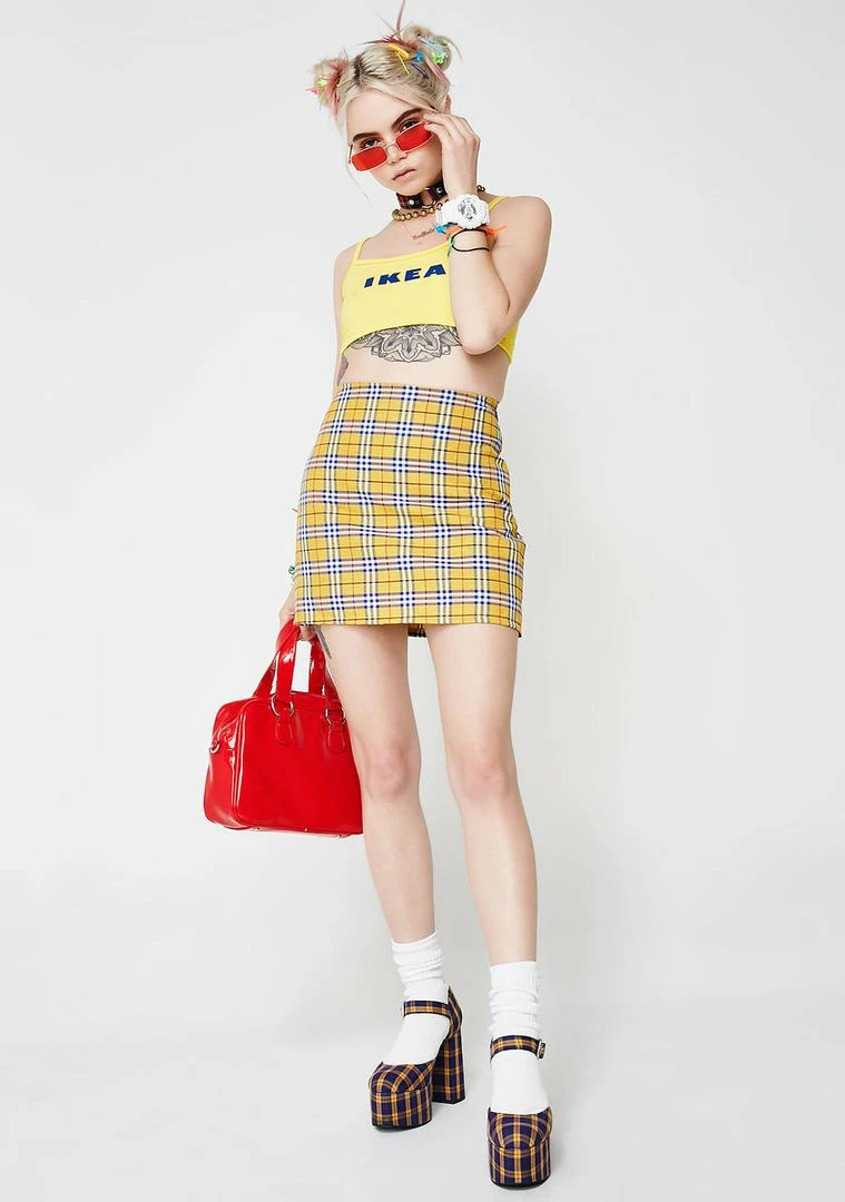 cuz you givinΓ’ΒΒ emΓ’ΒΒ AS IF vibez. Do whatever with this non stretch mini skirt that has a yellow tartan print all ova and a zip closure.