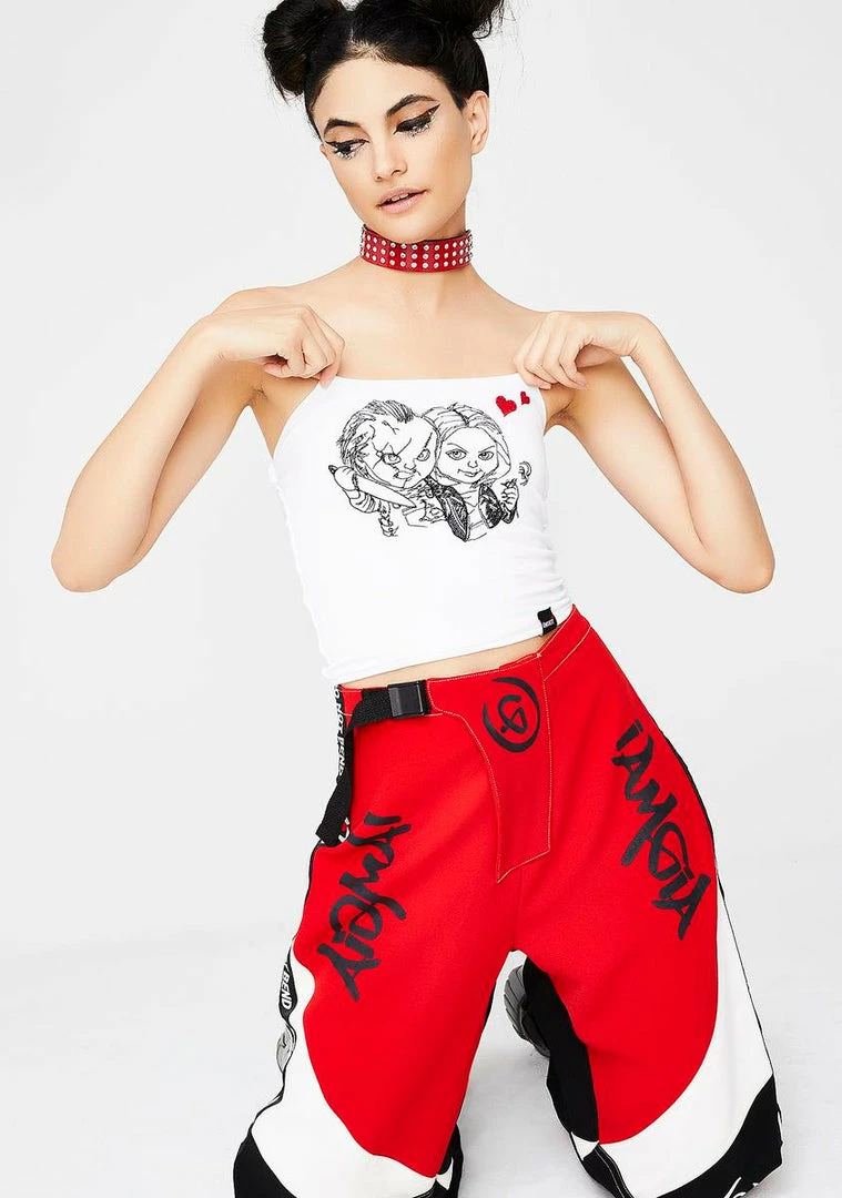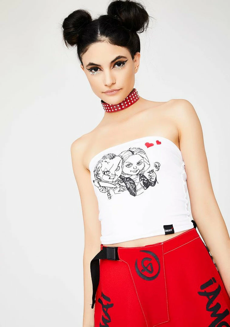 got รขยยem crazy in luv with ya. This white crop top has a strapless neckline and a black graphic of the two deadliest dolls on the front.
