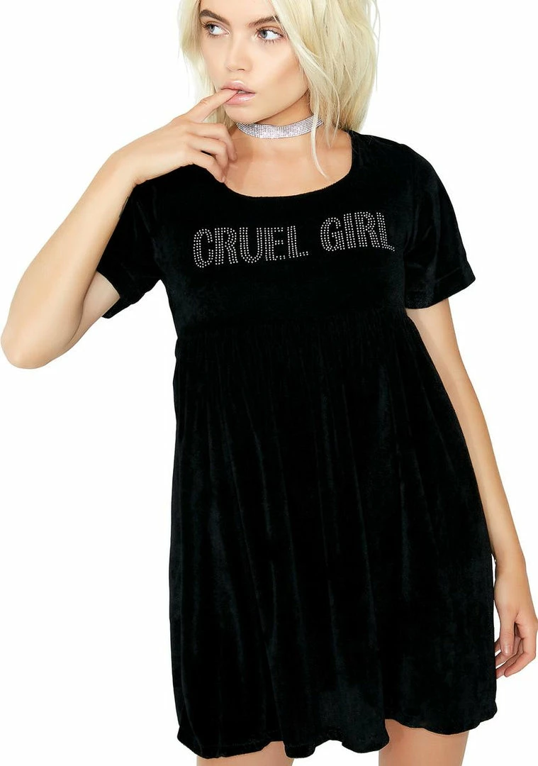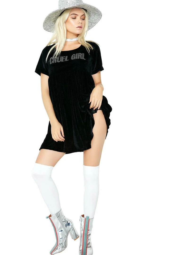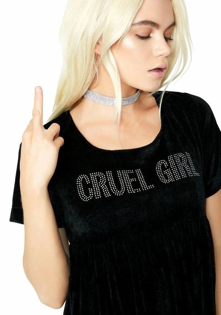 youΓ’ΒΒre not so innocent. This black velvet dress has a flowy skirt with silver bedazzled Γ’ΒΒCRUEL GIRLΓ’ΒΒ text across the chest, and a hidden zipper closure on the back.