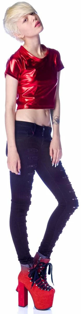 Disko Tee featuring a super shiny material thatΓΒs sure to pop, especially when youΓΒre out and about. This reflective material jumps on the mad holographic trend going on now. This tee seriously looks like freaking candy. Featuring a cropped length with short sleeves and a crew neck. Pair it with velvet leggings for a super rad contrast and finish with platform boots.