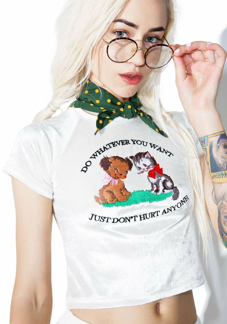 do no harm, but take no shit, bb…Let รขยยem know yer moral code with this mega cute cropped tee featuring a soft velvet construction, crew neck, cap sleeves and sweet graphic of a puppy Nรขยย kitty with print that reads รขยยDO WHATEVER YOU WANT JUST DONรขยยT HURT ANYONEรขยย.