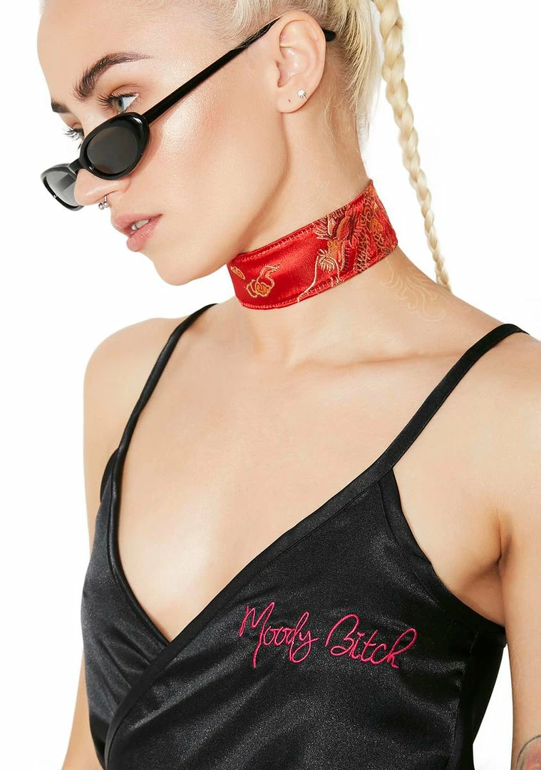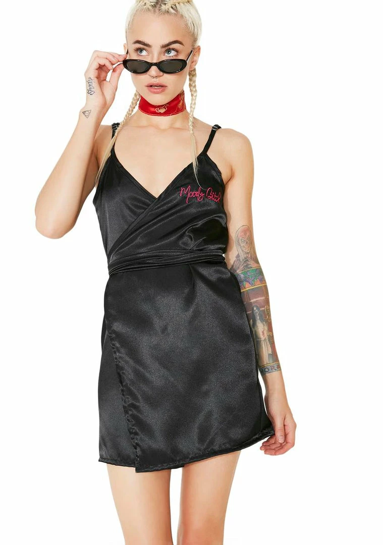 theyΓ’ΒΒre gonna find out eventually anyway…this sultry lilΓ’ΒΒ slip dress features a silky fabrication, pink embroidered text that reads Γ’ΒΒMoody BitchΓ’ΒΒ, adjustable straps, V-neckline and adjustable wrap-tie closure.