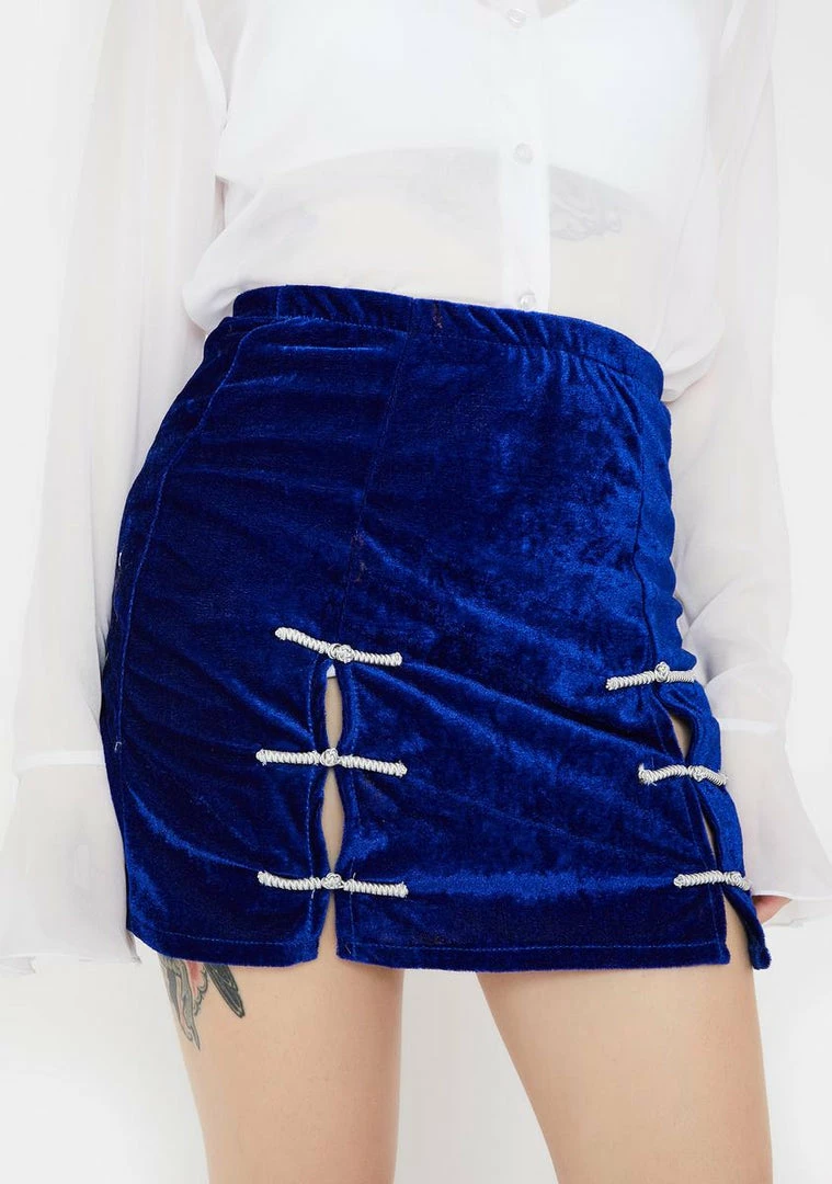 cuz you’re gonna cause some trouble. This lil navy blue mini skirt has a high waisted fit and slits on the thighs with silver thread details.