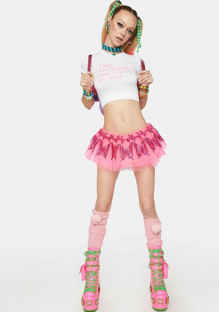 cuz youΓ’ΒΒre ready to rave. This soft and stretchy crop tee has short sleeves, a crew neckline, and pink text graphics that read Γ’ΒΒI bet she bangs like a fairy on acidΓ’ΒΒ on the front.