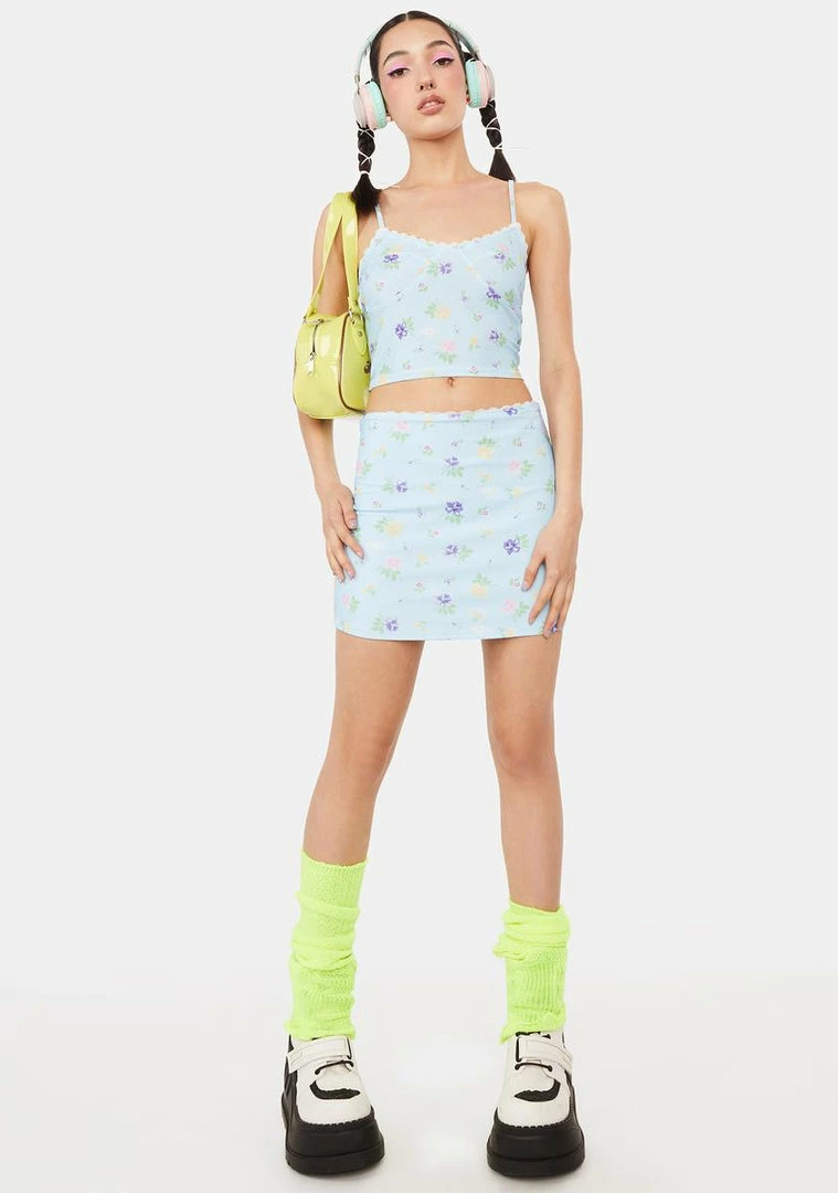 cheers to you! This crop top has a V-neckline with scalloped lace trim, stitching details below the bust, a floral print all over, and adjustable cami straps.