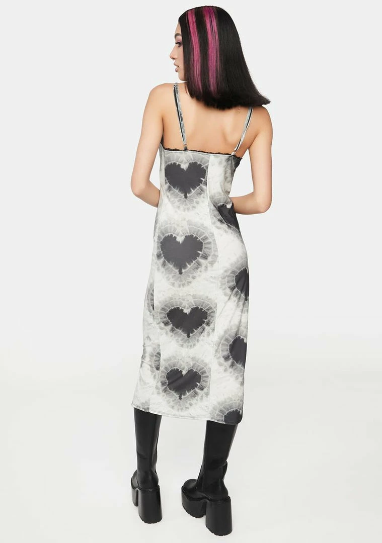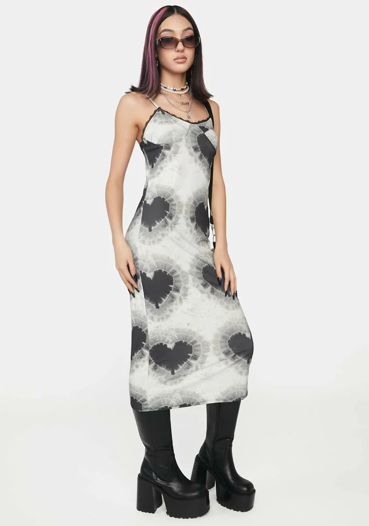 it’s you and me forever! This maxi dress has a tie dye heart print, stitching accents across the bust, lace trim, and adjustable cami straps.