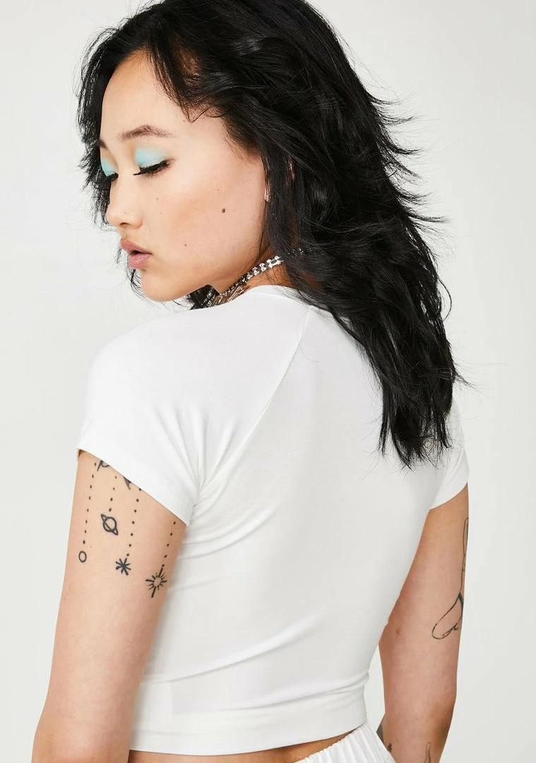 cuz you may be goin’ to hell, but at least all ya friends are too! The devil is waitin’ in this supa soft N’ stretchy baby tee that has short sleeves, a cropped fit, and glitter text graphics on the front.