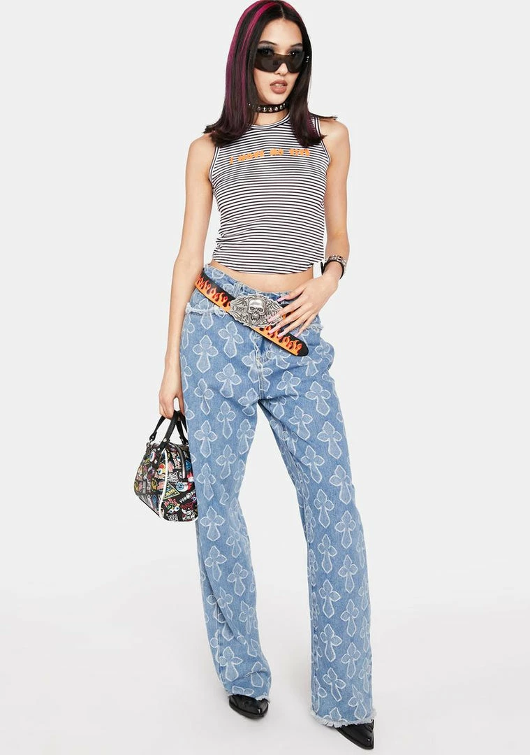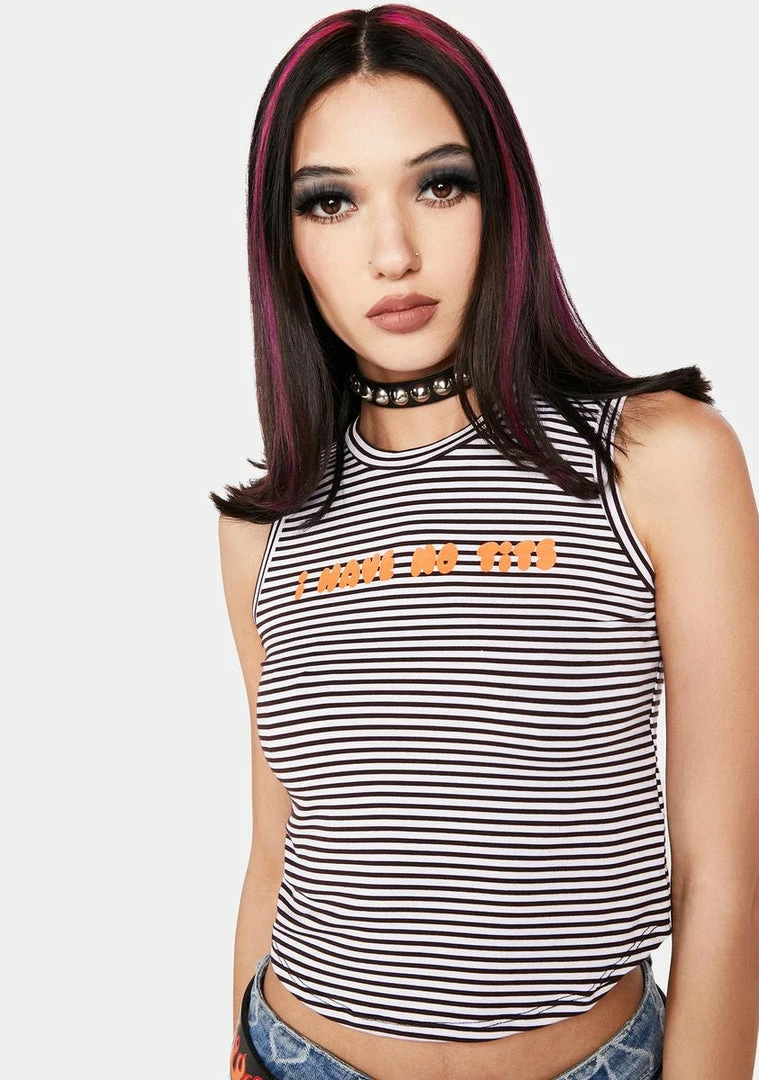 flaunt what ya got. This tank top has a horizontal striped design, text graphics printed across the chest, and a cropped hem.