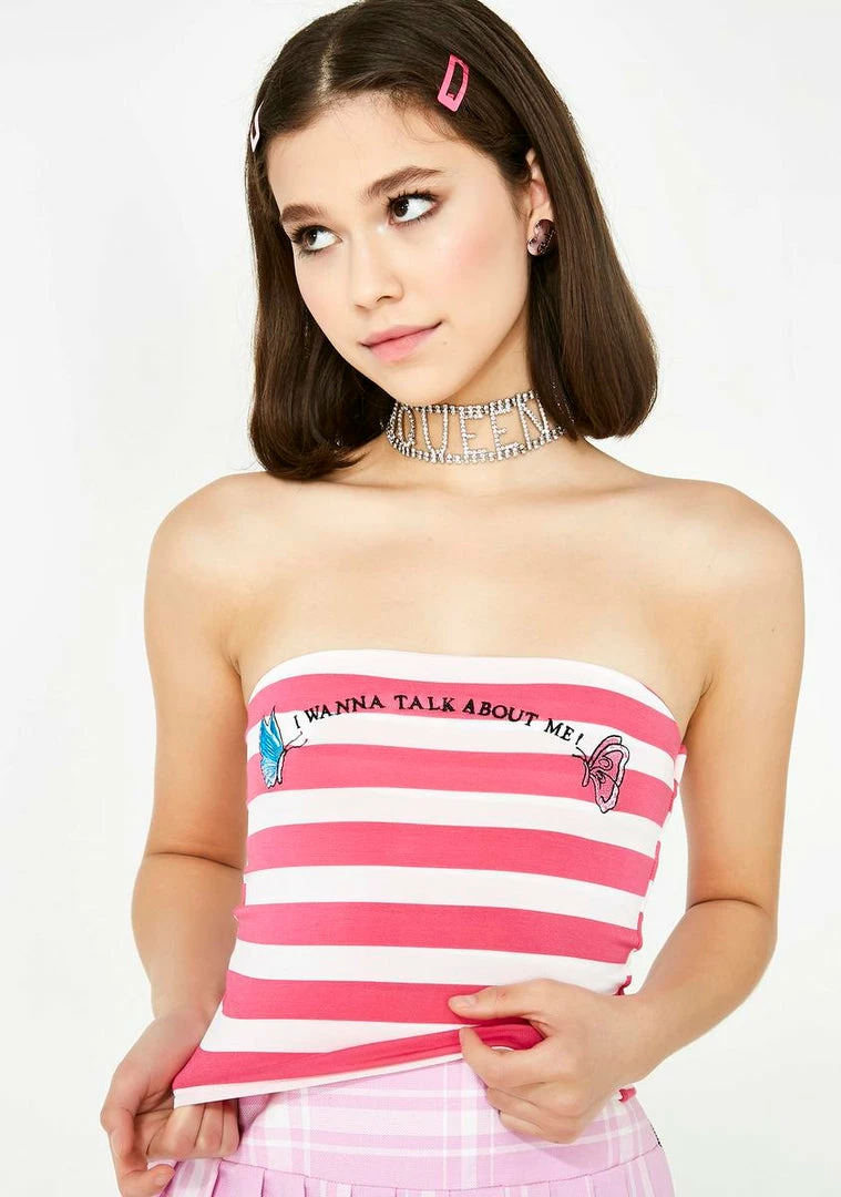 will have ya oozinΓ’ΒΒ self-confidence bb! Flaunt your cuteness in this stripe pattern tube top that has a stretchy AF fit and text slogans with butterfly graphics on the front.