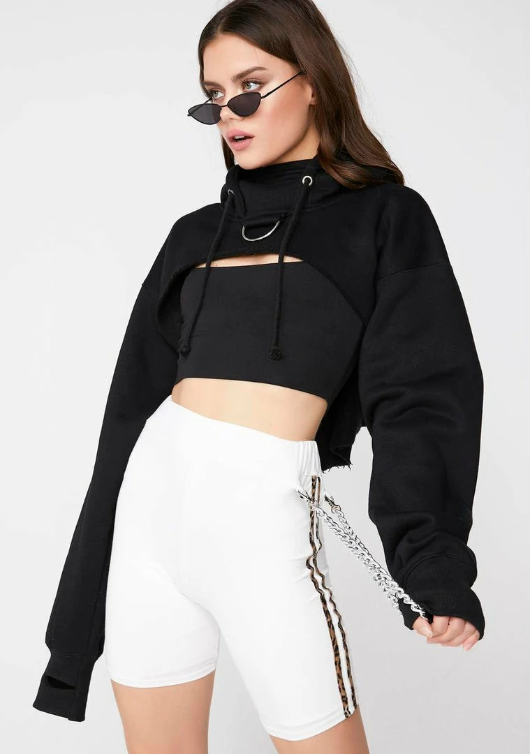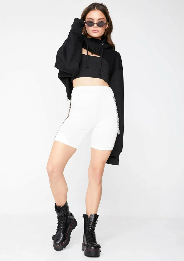gotcha servinâ badazz vibes. Stay flossinâ hunty in these savage high waist biker shorts that have double trouble layers for support, a supa stretchy material, Nâ a dope AF detachable chain.