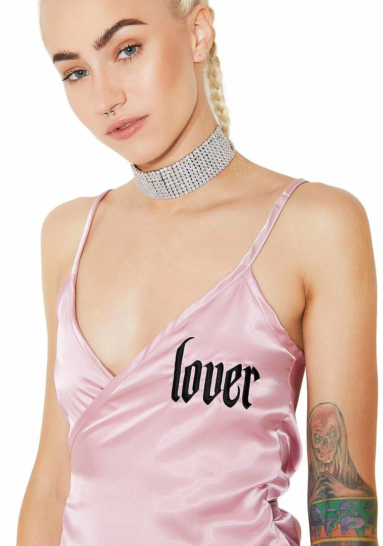 cuz youΓ’ΒΒre a lova, not a fighter babe…this sultry lilΓ’ΒΒ slip dress features a silky fabrication, embroidered text that reads Γ’ΒΒLoverΓ’ΒΒ, adjustable straps, V-neckline and adjustable wrap-tie closure.