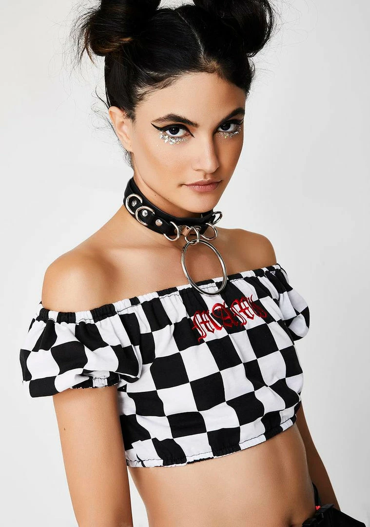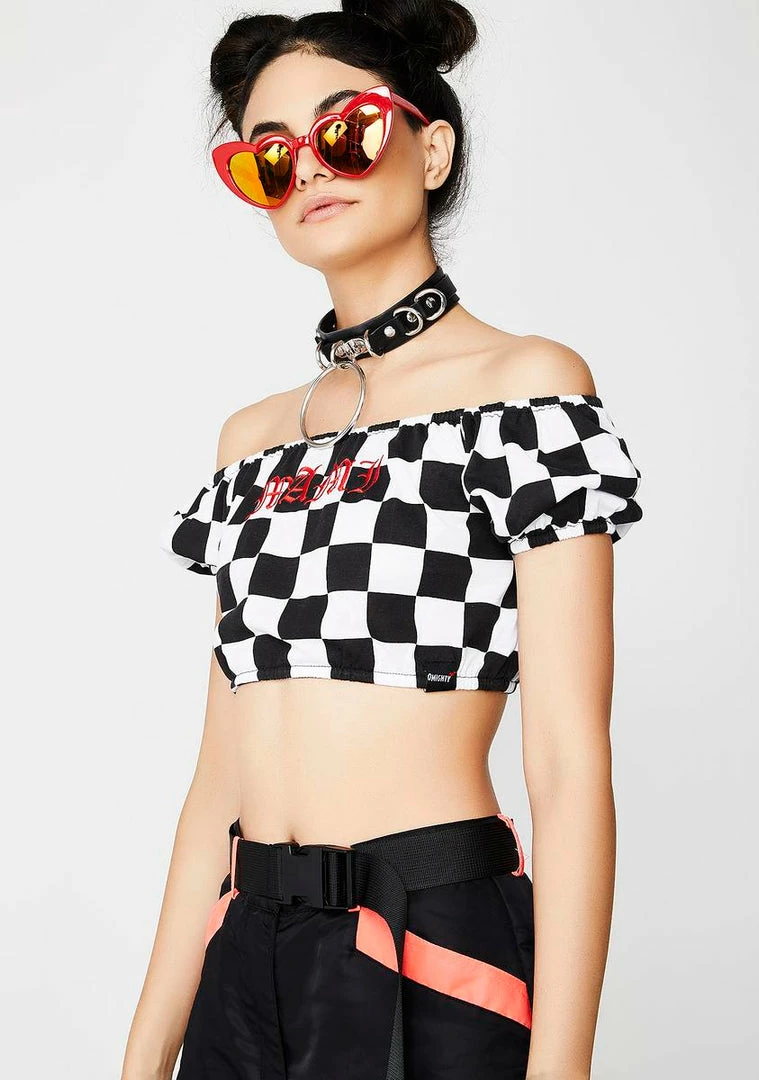 cuz youâre lookinâ fine af. This lil checkered crop top has an off shoulder neckline and red âMAMIâ text on the front.