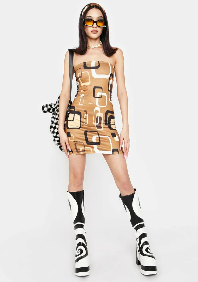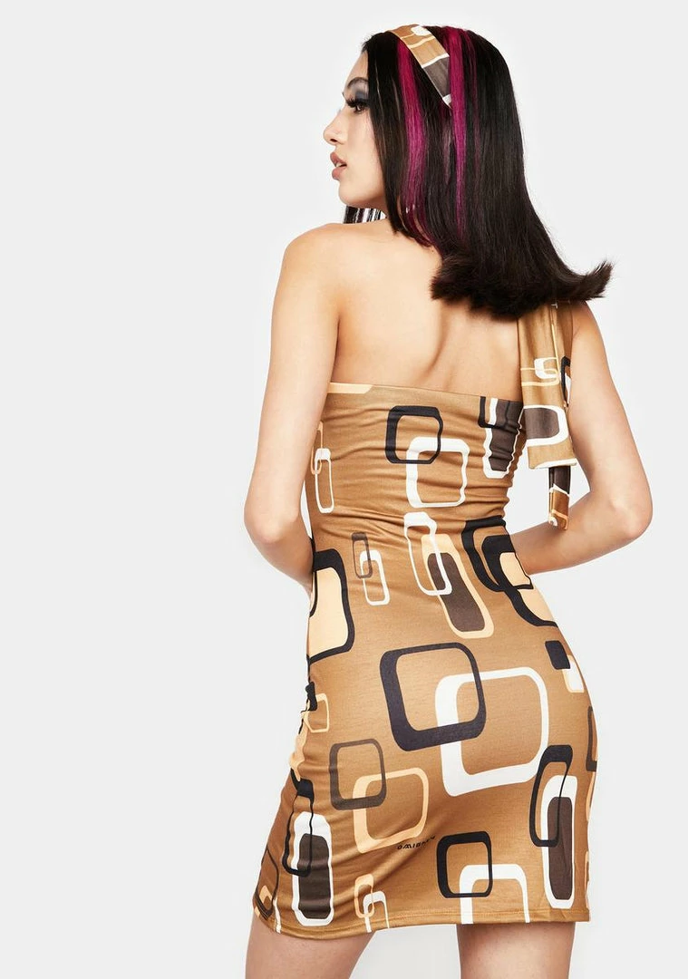 catch me on the big screen. This mini dress has a strapless neckline, a fully lined design, a geometric design all over, and comes with a matching scarf.