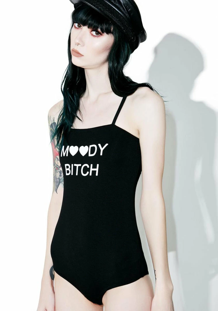 …hope yer not around when the swings hit! This dope sleeveless bodysuit features a curve hugginΓ’ΒΒ black construction, thin cami straps, and lettering on tha chest reading Γ’ΒΒMoody Bitch.Γ’ΒΒ