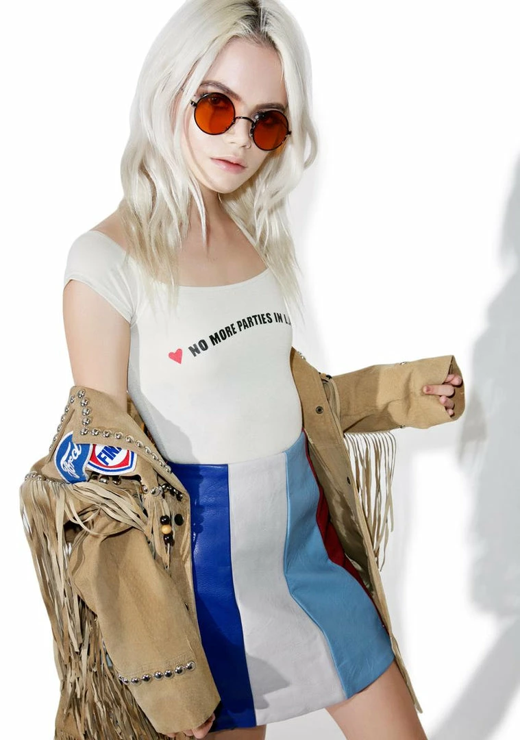 …please baby, no more! Show Γ’ΒΒem yer all partied out in this sikk bodysuit, featurinΓ’ΒΒ a stretchy Γ’ΒΒN curve hugginΓ’ΒΒ nude construction, off-the-shoulder style short sleeves, scoop back, and minimal black lettering reading Γ’ΒΒNo More Parties In L.A.Γ’ΒΒ on the chest.