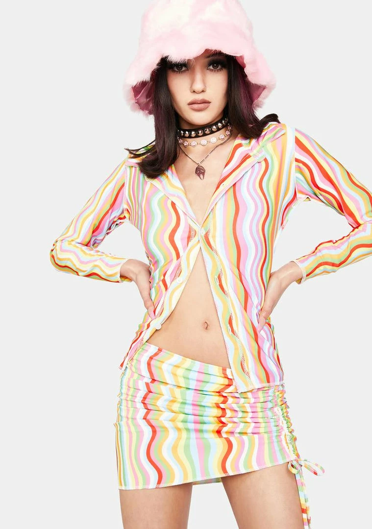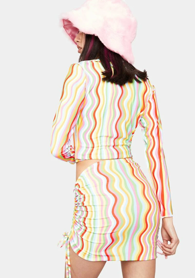 you go with the flow. This mini skirt has a mid-rise waist, a multi-color wavy print, and ruching details down the side with adjustable tie closures.