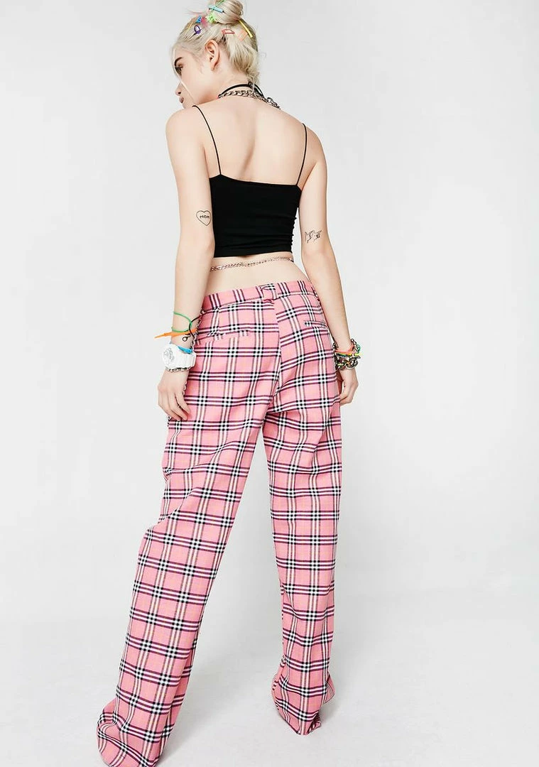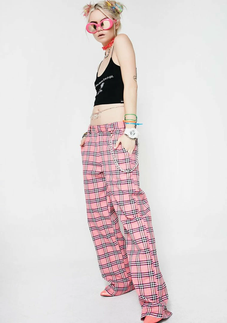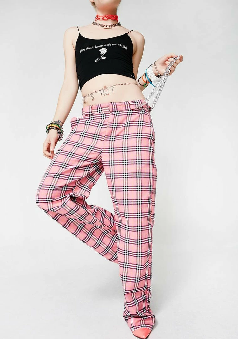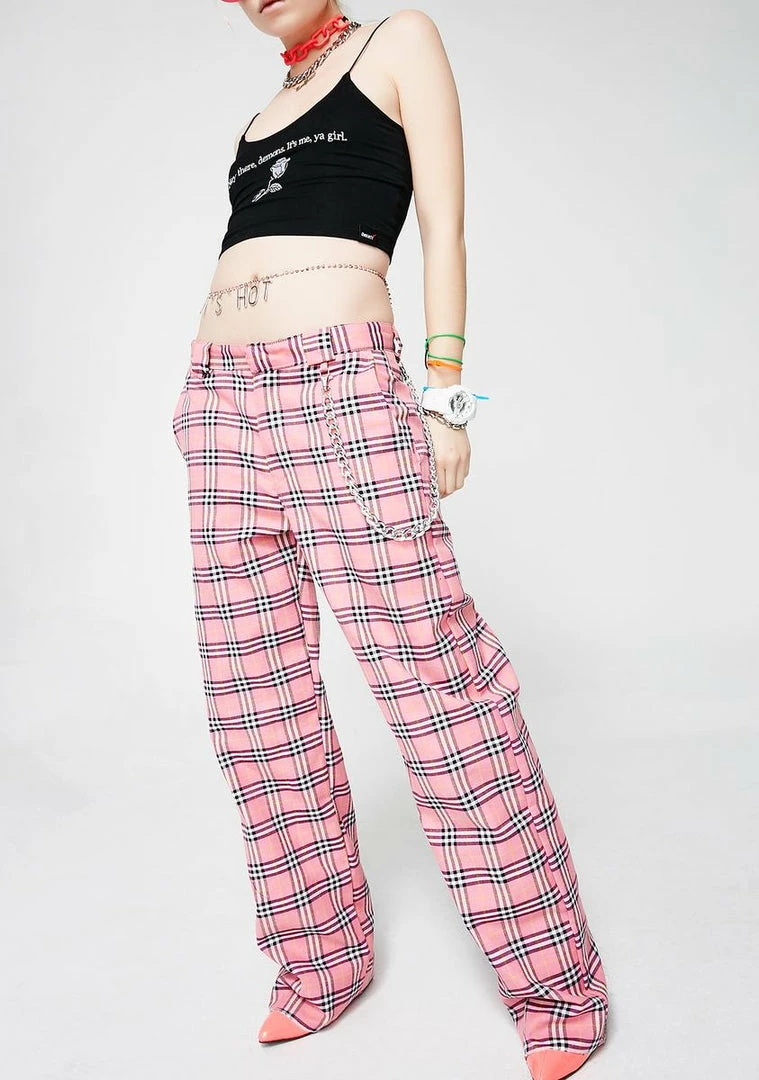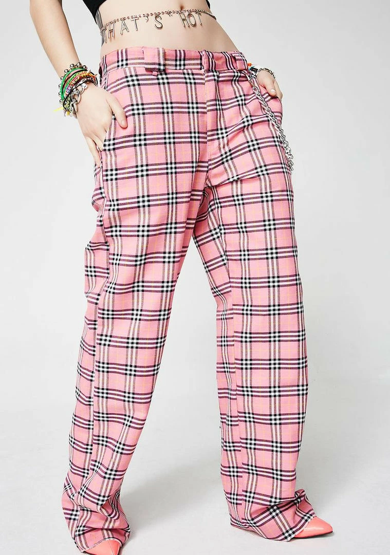 cuz you just a mean girl, bb. Be a baddie with these pants that have a pink tartan print all ova, a sikk detachable chain detail and a zip closure.