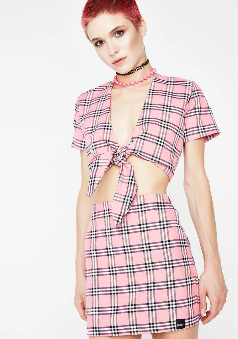 cuz on wednesdays we wear pink! Stick to da rulez in this cute lil plaid crop top with short sleeves and a front tie closure.