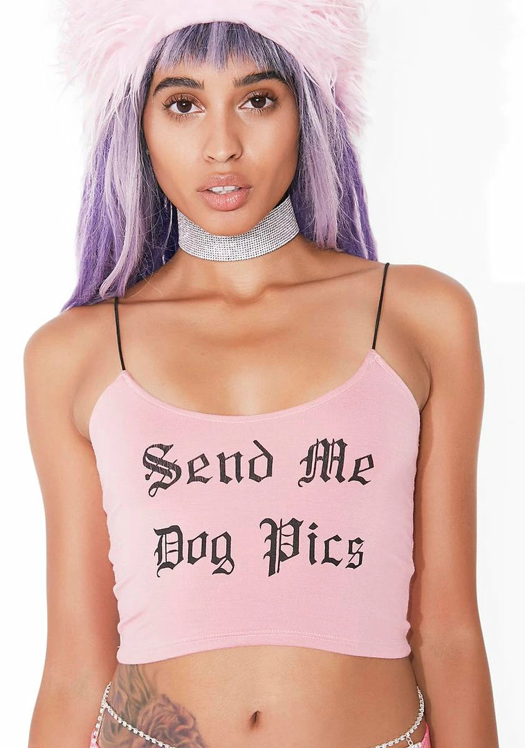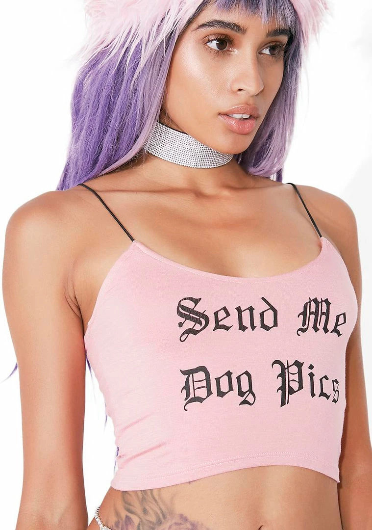 cuz yew donΓ’ΒΒt want more nudez. This cute lil tank features a light pink construction, black skinny straps, a scoop neckline, and black Γ’ΒΒSend Me Dog PicsΓ’ΒΒ text on da front.