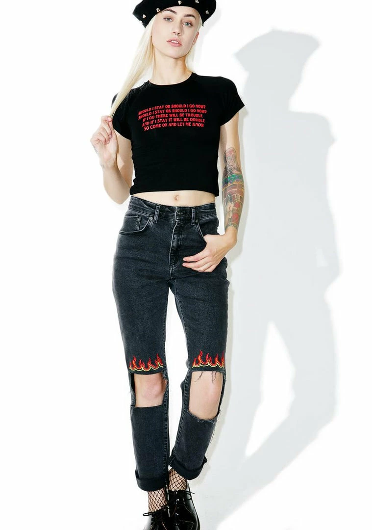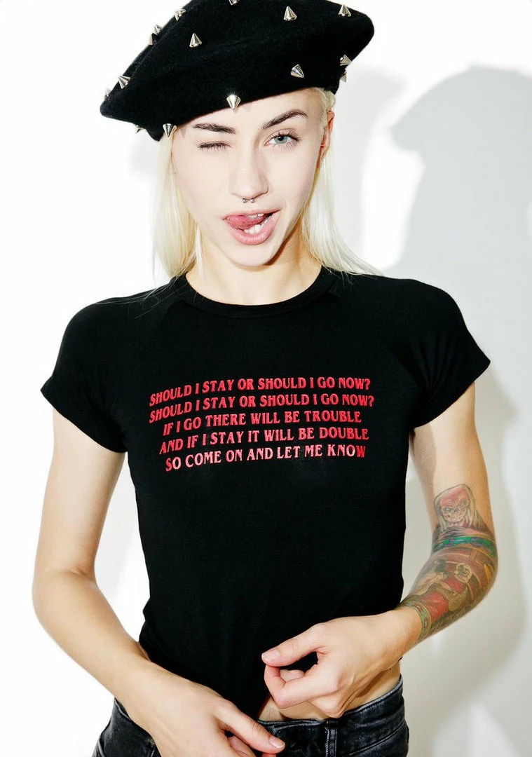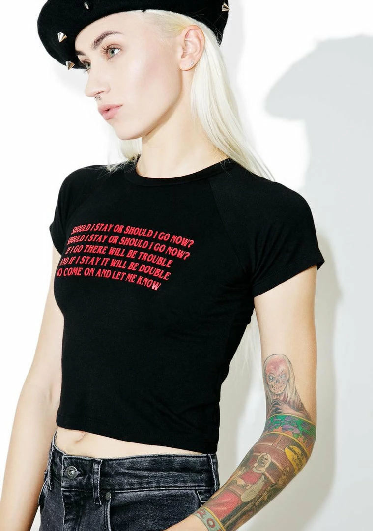 decisions, decisions⦠If I stay do I, like, get anythingâ¦? This dope cropped tee features an ultra stretchy âN curve hugginâ black construction, baby sleeves, and red text with classikk lyrics written across the chest.