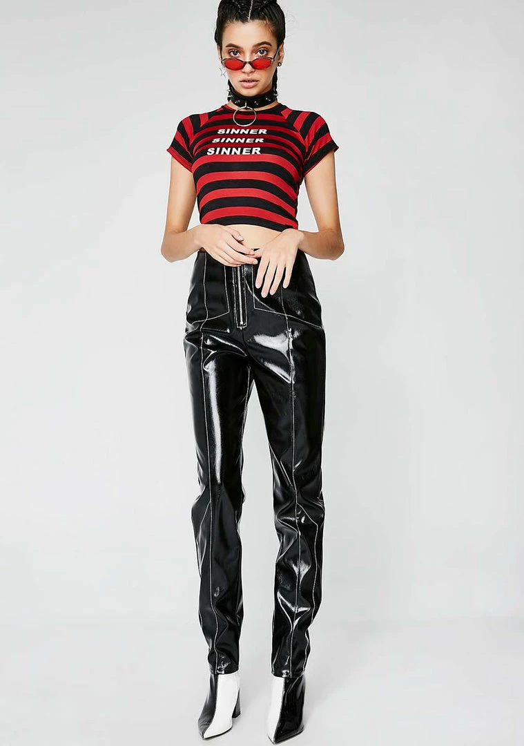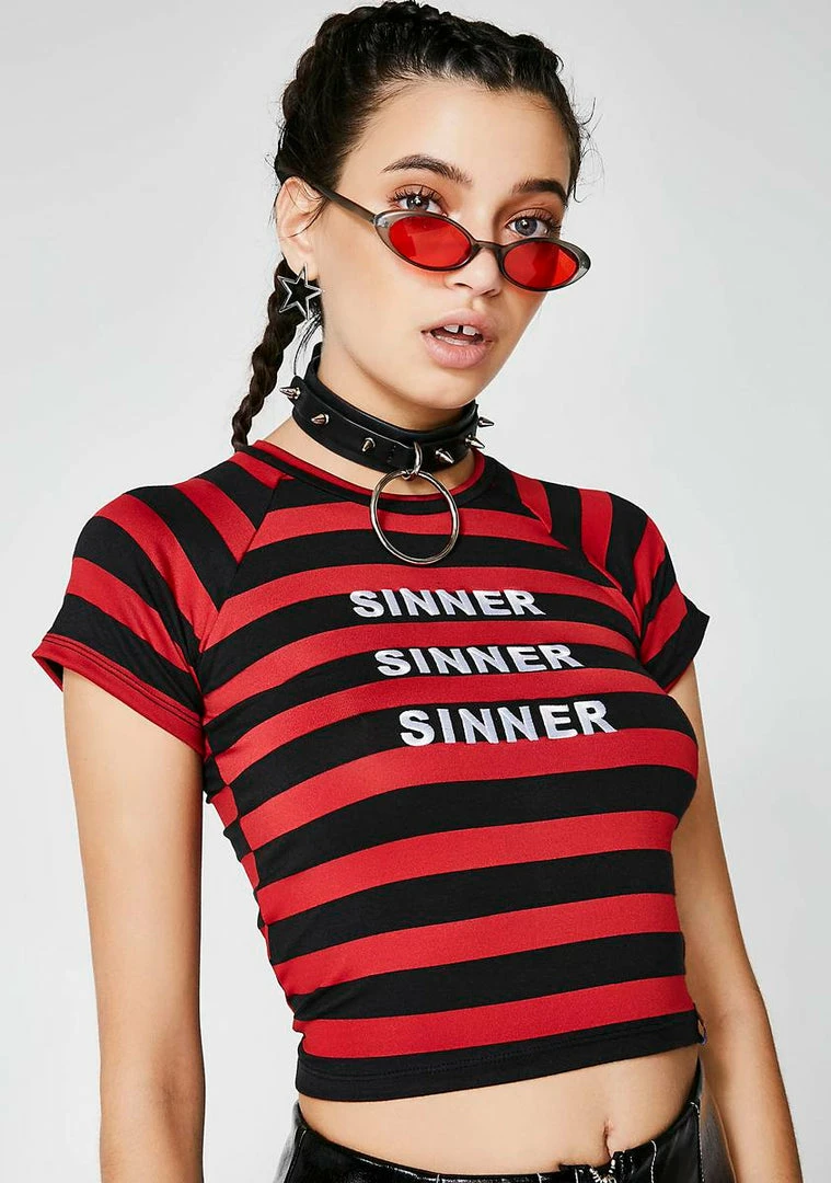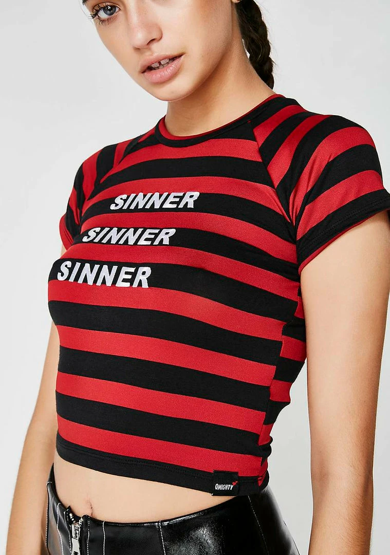 cuz it’s what u do best. This crop top has red NΓ’ΒΒ black stripes, a round neckline, short sleeves, and white Γ’ΒΒSINNERΓ’ΒΒ text on the front.