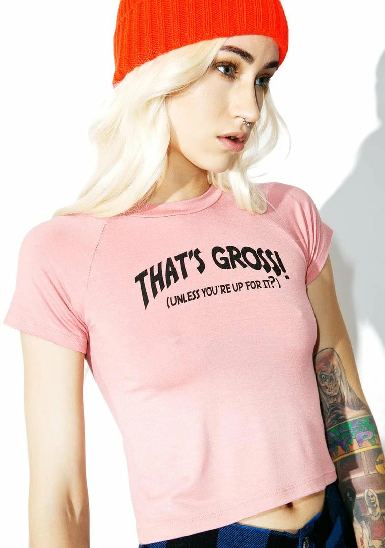 cuz youΓ’ΒΒre game for anything, arenΓ’ΒΒt ya? This supa cute crop features all-over stretch for a nice fitted look and text printed on the front that says Γ’ΒΒThatΓ’ΒΒs Gross! (Unless youΓ’ΒΒre up for it?)Γ’ΒΒ.