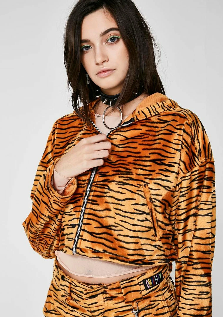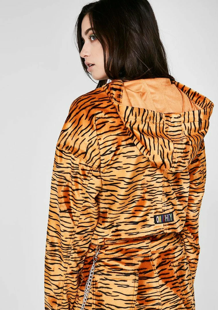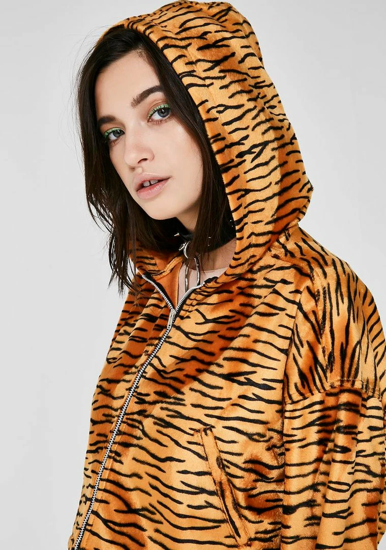got you on the prowl. Feel like a bad kitty with this non-stretch faux fur cropped hoodie that has a tiger print all ova, a pocket on the sides and a zip closure.