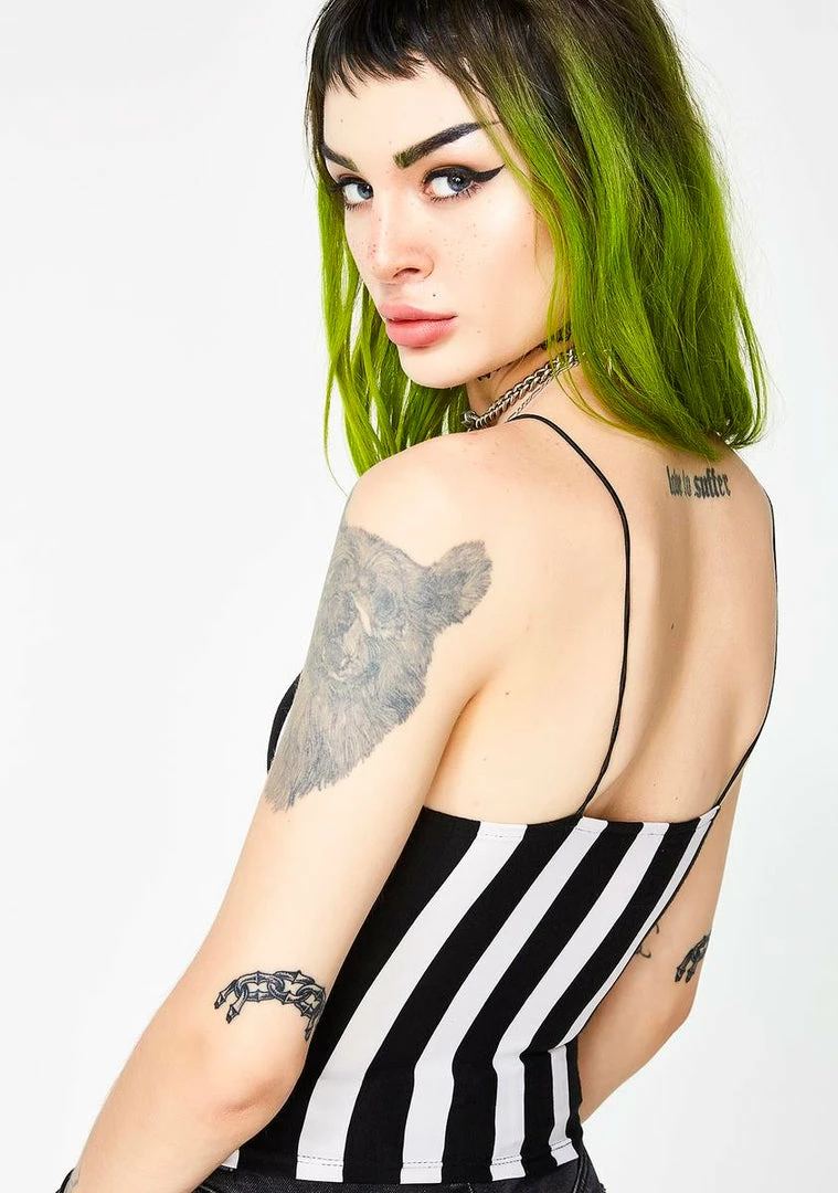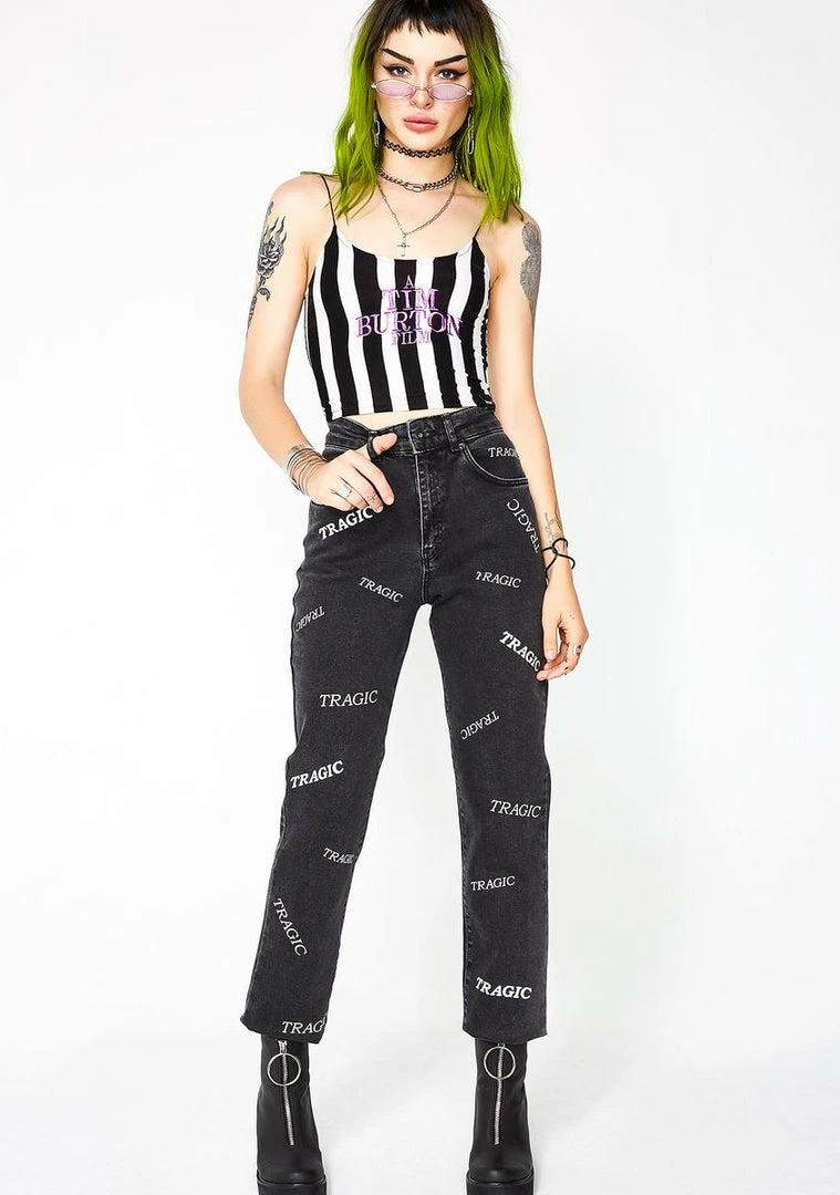 cuz your life is a creepy wonderland! This sikk striped cropped tank has a scoop neck and the words รขยยA Tim Burton Filmรขยย embroidered on the front.