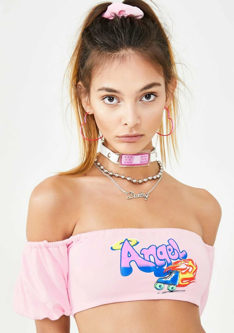 cuz youΓ’ΒΒre a gift from above, hun! Show em your good side in this hella cute tube top that has a supa cropped fit, ‘Angel’ graphics, NΓ’ΒΒ off the shoulder puff sleeves.