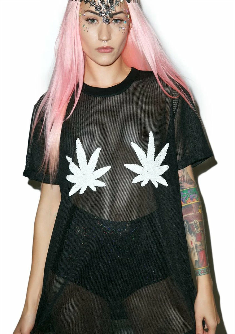 cuz real stonerz smoke everyday. We know ya keep it lit 24/7! This dope af mesh t-shirt is constructed from a black colored mesh material and features hand sewn sequin weed leaf embellishment by Tials perfectly placed over them tiddys, complete with a perfectly oversized fit.