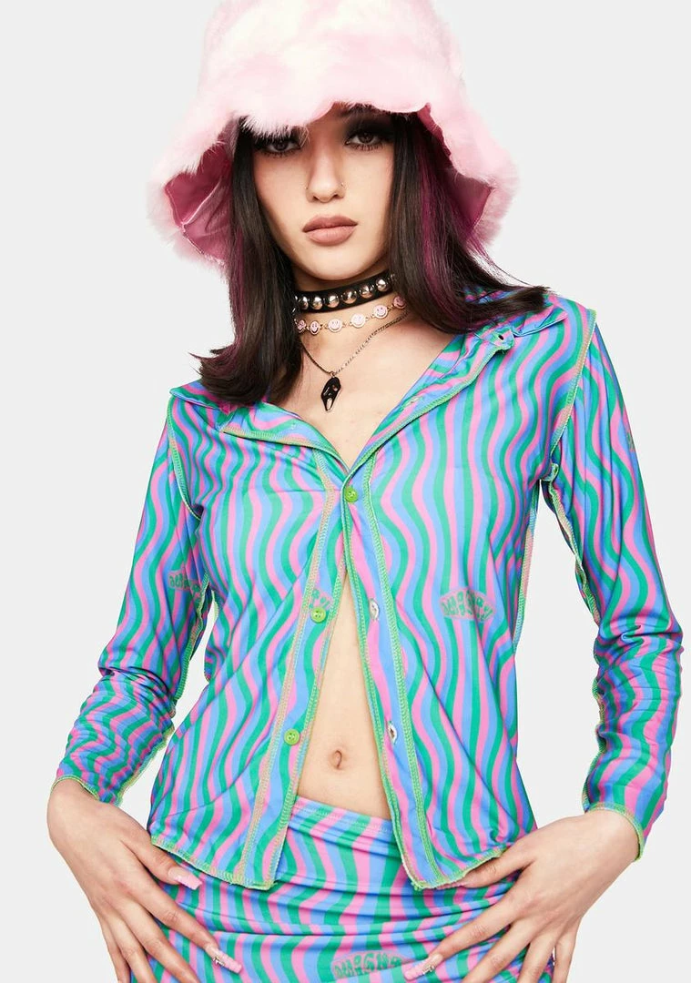 you go with the flow. This long sleeve top has a collared neckline, a multi-color wavy print, and button closures down the front.