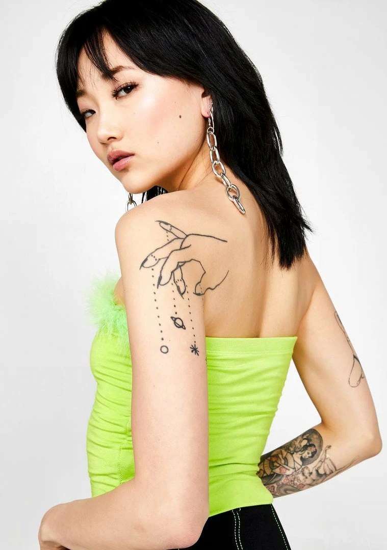 gotcha lookinΓ’ΒΒ dank AF. Have Γ’ΒΒem trippinΓ’ΒΒ off ya in this dope lil crop top that has glittery embroidered graphics, sikk faux fur trim NΓ’ΒΒ is stretchy AF.