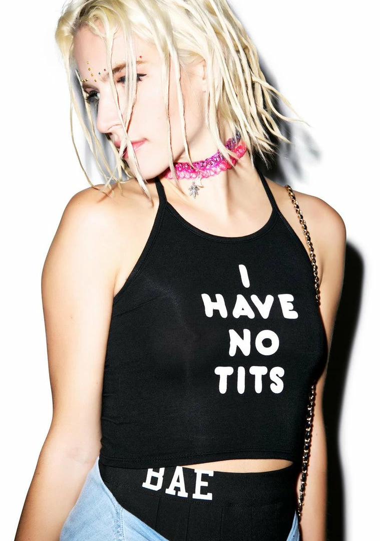 O Mighty I Have No Tits Halter Top, own yer tiny titties!!! This amazing slightly cropped top features adjustable halter shoulder straps, to keep yer itty bitty bits in place, and the supa stretch fabric will make this BB a perfect fit every time. Show off what else ya got with the mid torso cropped fit, and open back, so even though this tops reads, ÂI have no tits it wonÂt matter, you’ve got everything else youÂll ever need.