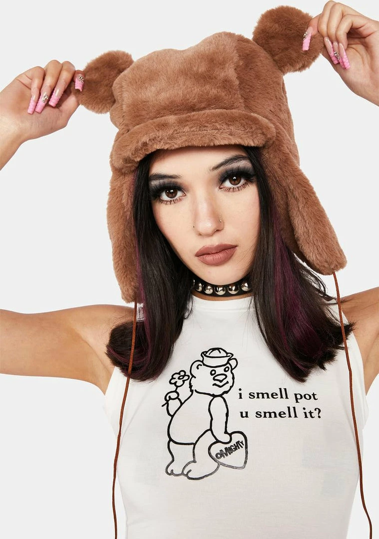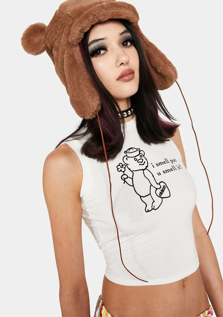 don’t be shy, share! This tank top has text printed across the front with a sweet bear graphic and a cropped fit.