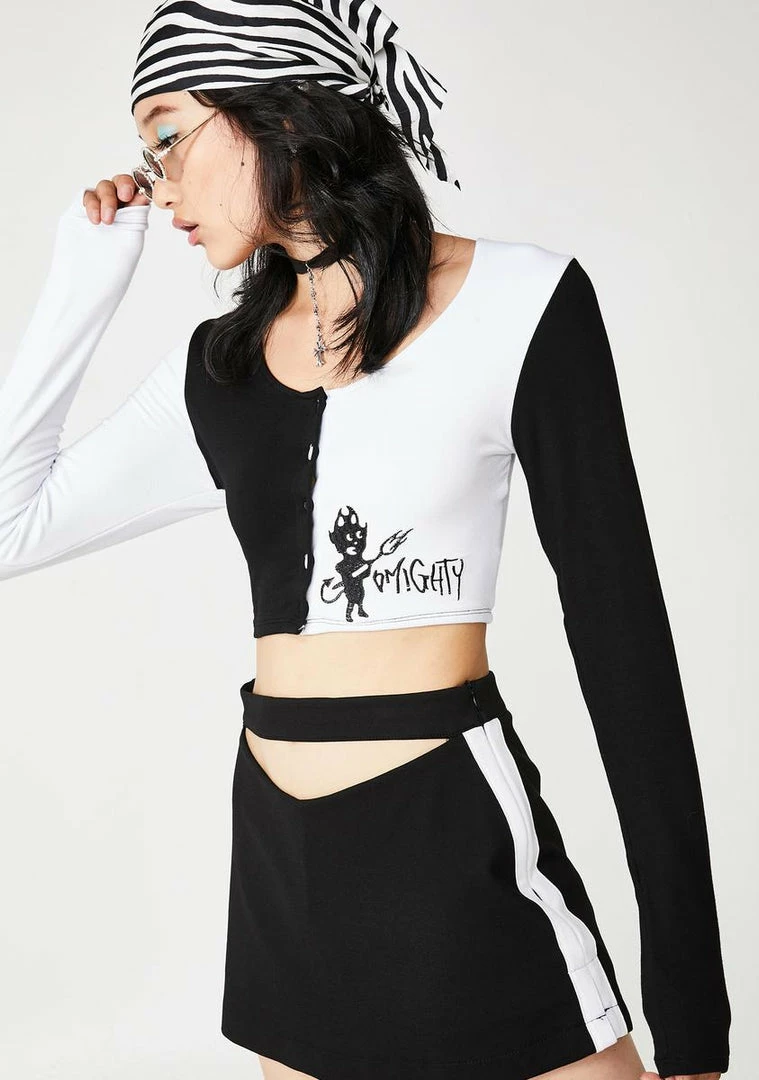 gotcha lookinΓ’ΒΒ for ya long lost lover. ItΓ’ΒΒz a bad romance in this color block long sleeve top that has a cropped fit, snap button closures, and graphics on the front.