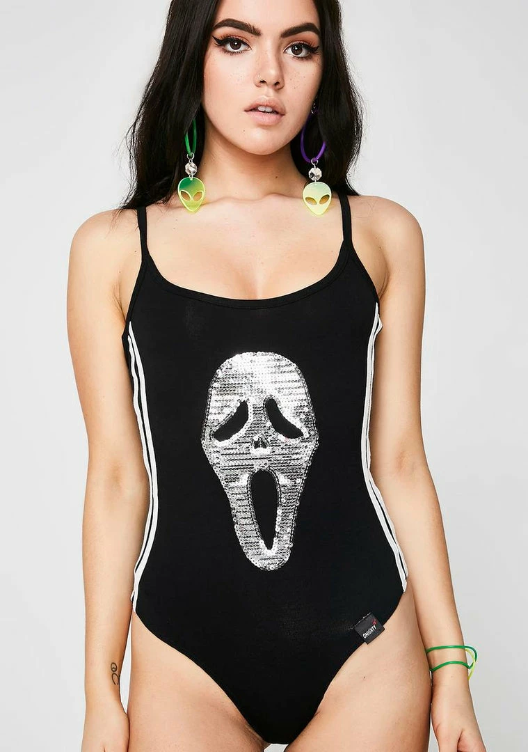 cuz you got emรขยย scared of you. Be a threat with this bodysuit that has a sequin scream mask on the front, stripes on the sides and a thong bottom.