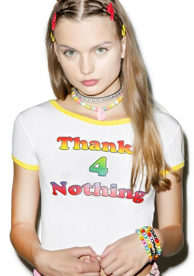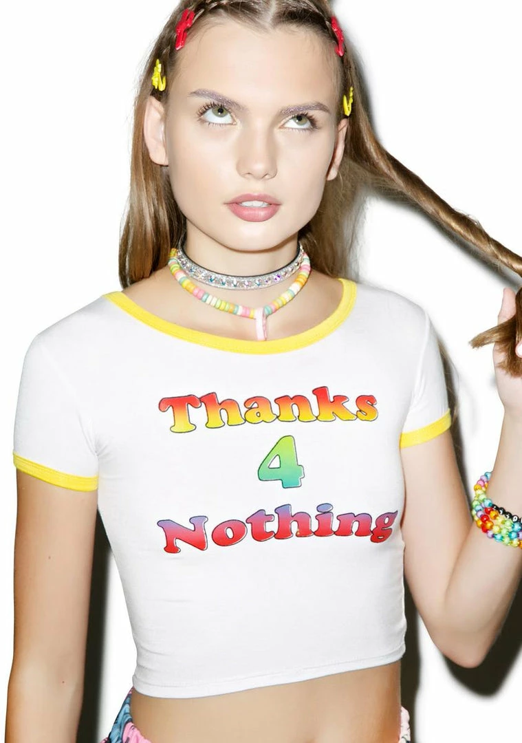O Mighty Thanks 4 Nothing Ringer Tee cuz people can be such a let down sometimes. This dope cropped tee knows ya canΓΒt rely on anyone but yer damn self. FeaturinΓΒ a sikk print with, ΓΒThanks 4 NothingΓΒ filled in pretty rainbow ombre color and cool contrast trim. With a seXXXy snug fit, crop hemline and short sleeves, this soft and stretchy BB will match yer super sassy attitude. We will always be there for ya, especially when yew look super hot in this tee.