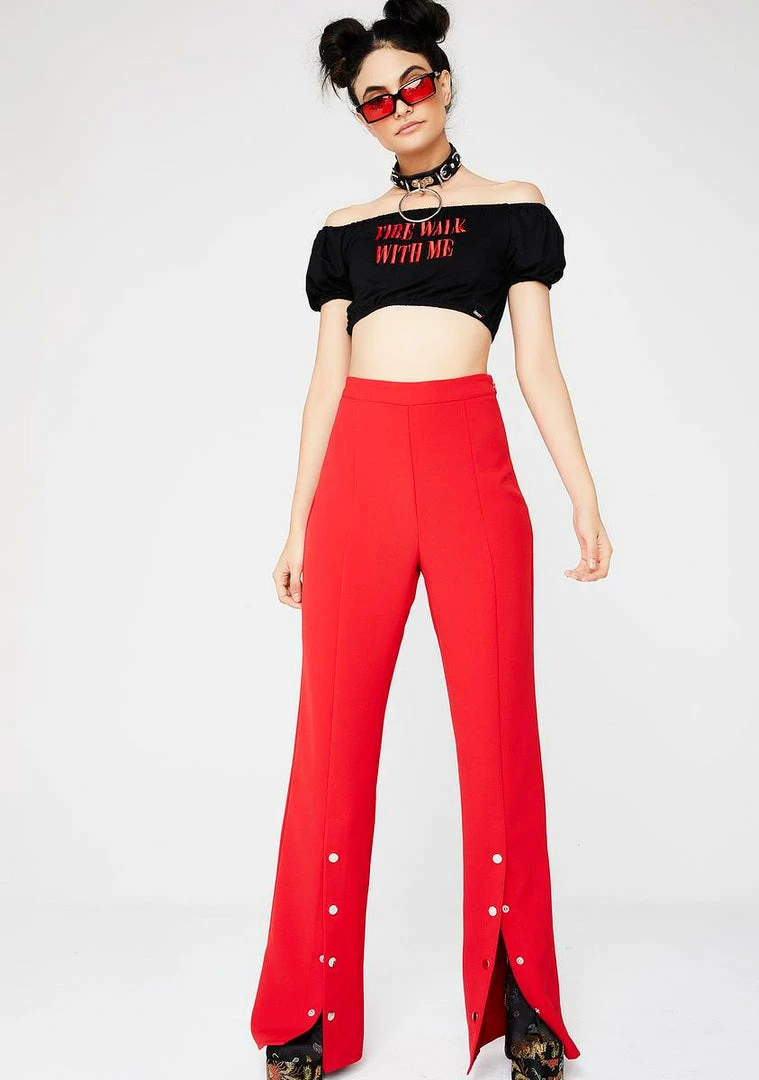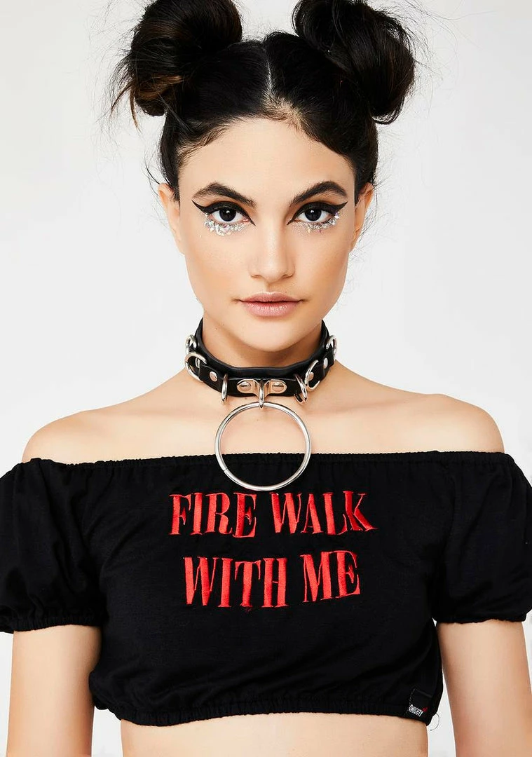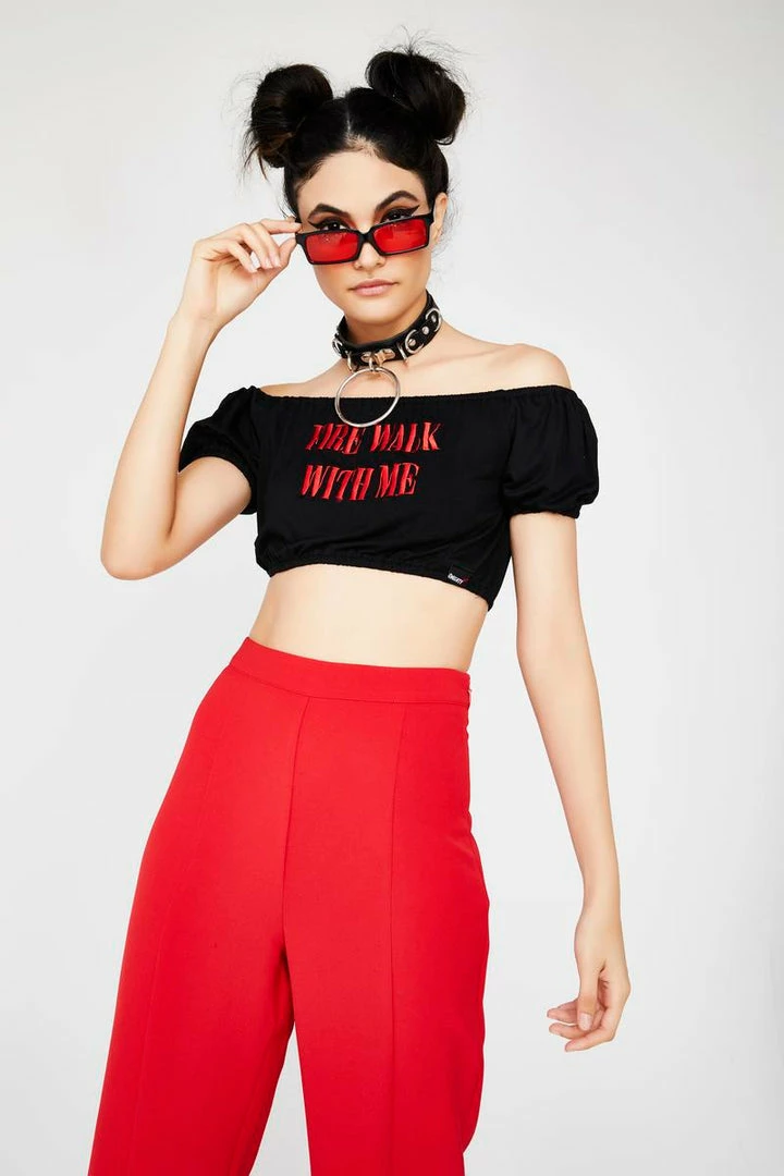 cuz you bring the heat. This lil black crop top has an off-shoulder neckline and red Γ’ΒΒFIRE WALK WITH MEΓ’ΒΒ text on the front.