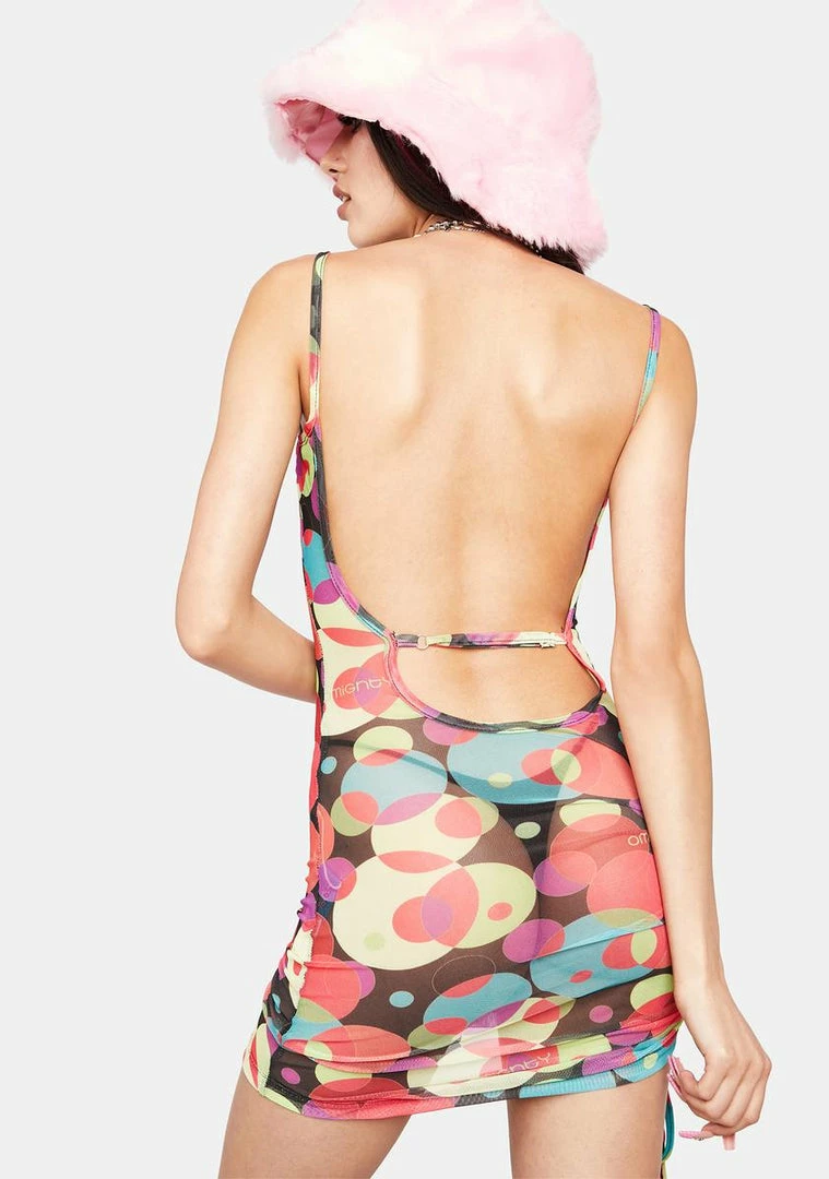 cuz you must be out of a dream! This mini dress has a mesh construction, an abstract rainbow design, a scoop neckline, a low back, and ruching details at one side with adjustable ties.