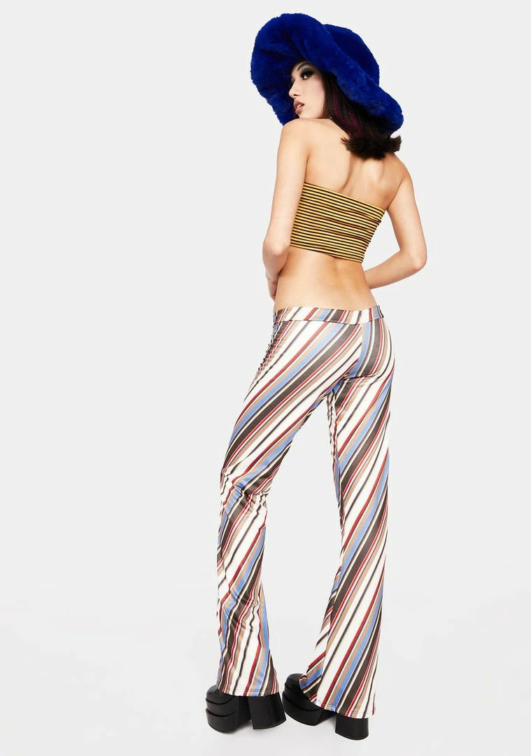 you know how to play it cool. These pants have a low-rise fit, a drawstring waistband, a flared leg silhouette, and a multi-color stripe print.