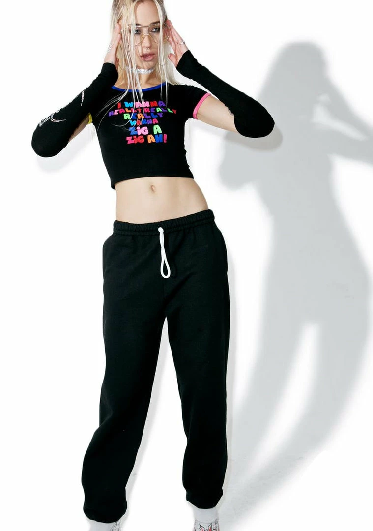 cuz we really wannabe just like yew, bb! Pay homage to tha queenz of the 90s in this sikk ringer tee, featurinΓ’ΒΒ a stretchy black construction, cropped fit, contrasting colored trim, and multicolored lyrics across tha chest thatΓ’ΒΒll make Γ’ΒΒem wanna sing along!